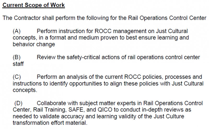 地铁本身最近结束了一个报价请求培训和文化ROCC评估。采购文档说培训是关注“只是文化概念”——一个错误和事件通常是组织的一个产品,而不是可能已经做了错的人。