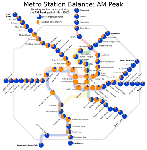 在高峰期,最平衡的站是贝塞斯达。几乎完全相同数量的人进入车站出口。五角大楼,Brookland国王街,和弗农山庄广场前五名。