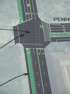 双向cycletrack会在宾夕法尼亚大道的中值,15日街自由广场到第三街之间。骑自行车的人会使用的信号通过交通作为指标时是安全的。离开cycletrack时,他们会做出一个“行人左”继续通过路口的绿灯,停止在中间等待垂直走/绿灯信号。如果右转,他们将停止在中间,等待垂直行走标志/绿灯或将他们的方式对一个车道的方法。