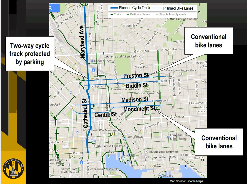 马里兰大街cycletrack将成为第一个一系列互补的项目,扩展和改进去巴尔的摩的自行车网络?直流和匹兹堡的网络的快速增长使我们乐观,魅力城市也会很快赶上的势头。