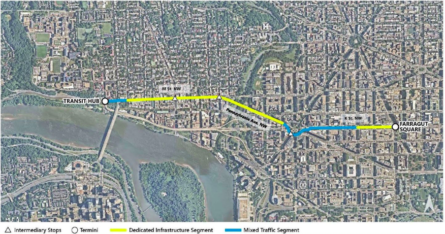 -杜邦环城地铁和乔治城之间的快速公交连接将沿着新罕布什尔大道、L街西北、宾夕法尼亚大道和M街西北运行;乔治敦终点站将位于M街西北的前埃克森美孚(Exxon)旧址和29号公路的关键桥(Key Bridge),大部分路线都在专用车道上。